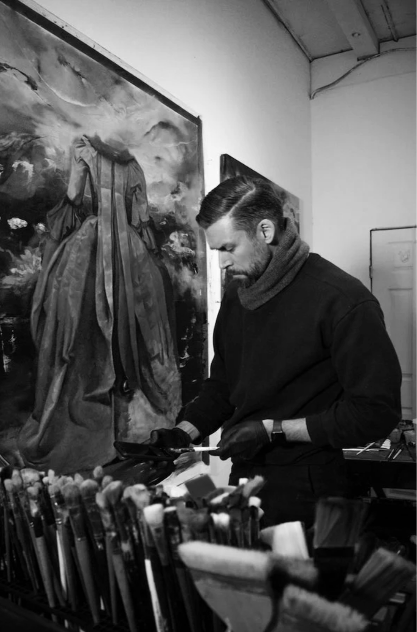 Audun Grimstad works with a figurative gallery, where the suggestion of a narrative is hidden in the folds of his silk costumes. His motives plays with the distinction between the abstract and the figurative, between boldness and suggestions. Like a scenographer, Grimstad is working with the different acts of a theatrical play, where the audience has to play out the narrative themselves.